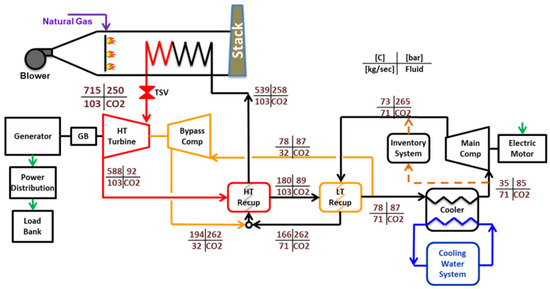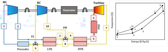 A recompression Brayton cycle (Figure 1) employing supercritical CO2 as the baseline working fluid was modeled [37,38]. The system configuration comprises a low-temperature (LT) recuperator, a high-temperature (HT) recuperator, a main compressor, a recompressor, a primary heat source that elevates the fluid temperature prior to turbine expansion, and a cooler that reduces the fluid temperature and pressure following expansion and recuperation, preceding compression.