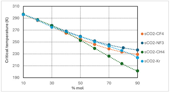 Figure 2 illustrates the variation in critical temperature of supercritical CO2-based binary mixtures as a function of additive molar concentration, ranging from 10 to 90 mol%. All four investigated mixtures—CO2/CH4, CO2/CF4, CO2/NF3, and CO2/Kr—exhibit a consistent decline in critical temperature with increasing additive content. This trend reflects the dilution effect imparted by the lower-critical-temperature additives on the CO2-rich base fluid.