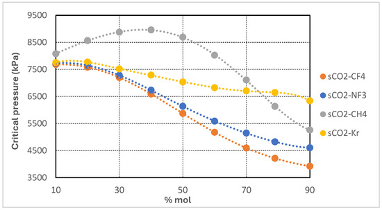 Conversely, the CO2/CF4 and CO2/NF3 mixtures display a more regular and nearly linear decline in critical pressure, with CO2/CF4 exhibiting the steepest reduction—falling below 4000 kPa at 90 mol% concentration. The CO2/Kr mixture shows the mildest response, maintaining critical pressures above 6000 kPa across the full composition range, consistent with krypton’s relatively higher critical pressure.