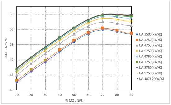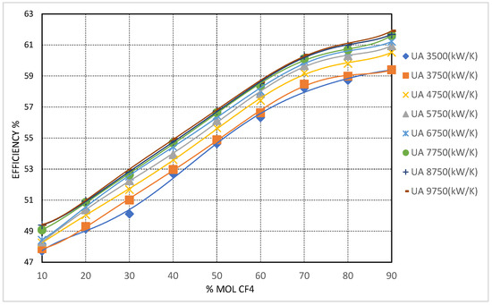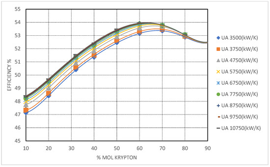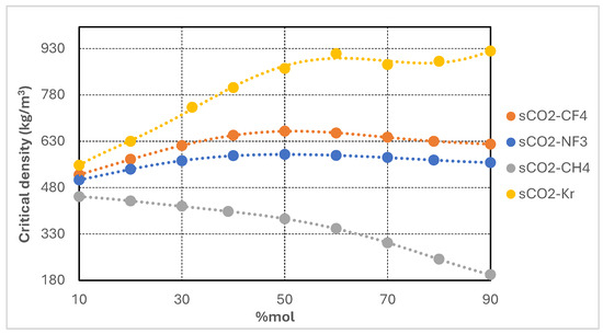 Figure 4 illustrates the variation in critical density of supercritical CO2-based binary mixtures as a function of additive molar concentration. The four analyzed mixtures—CO2/CH4, CO2/CF4, CO2/NF3, and CO2/Kr—exhibit markedly different trends with increasing additive content. The CO2/Kr mixture demonstrates the highest increase in critical density, exceeding 880 kg/m3 at high krypton concentrations, attributable to krypton’s intrinsically high critical density. This behavior is advantageous for cycle components, as increased working fluid density enhances compressor suction conditions, reduces volumetric flow rates, and facilitates more compact turbomachinery and heat exchanger designs. These benefits support more efficient compression stages and a reduced equipment footprint.