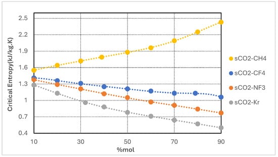 Figure 5 depicts the variation in critical entropy of supercritical CO2-based binary mixtures as a function of additive molar concentration for the CO2/CH4, CO2/CF4, CO2/NF3, and CO2/Kr systems. Two distinct trends are observed. The CO2/CH4 mixture exhibits a monotonic increase in critical entropy, reaching values exceeding 2.4 kJ/kg·K at high CH4 concentrations. This behavior reflects the broadening of the two-phase envelope and the increased molecular disorder near the critical point, characteristic of light, highly volatile additives such as methane. In contrast, the CO2/Kr, CO2/NF3, and CO2/CF4 mixtures demonstrate a progressive decline in critical entropy with increasing additive content, with the CO2/Kr blend exhibiting the lowest entropy values across the entire composition range.