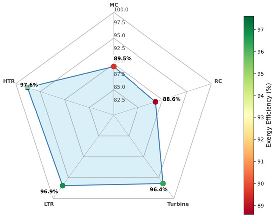 The following expressions provide a quantitative representation of the exergetic efficiency of the individual components that constitute the given cycle [40]: