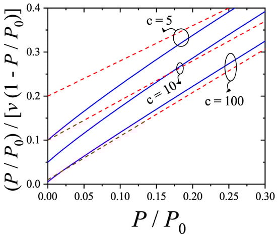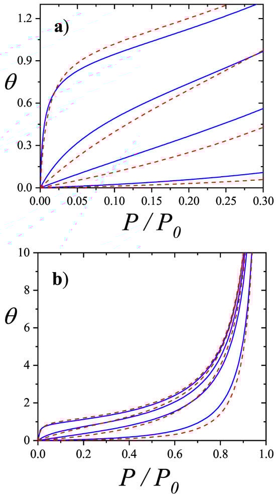 The adsorption isotherm Equation (25) is shown in Figure 2a,b for small, medium, and large values of the parameter c, in comparison with the BET isotherm