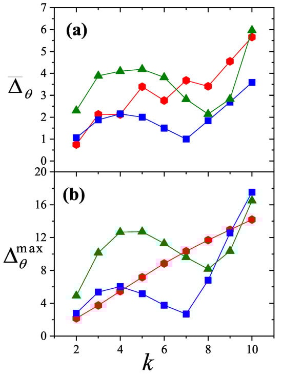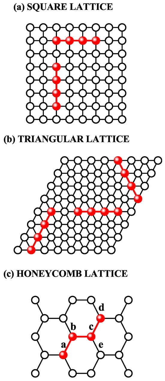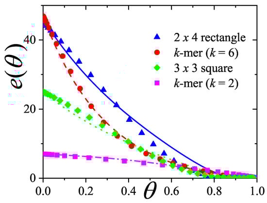 For square and triangular lattices (see Figure 4a,b), defining a linear k-mer is straightforward: it refers to a sequence of k monomeric units aligned along a straight path on the lattice. However, in the case of the honeycomb lattice, its intrinsic geometry prevents the formation of such strictly linear chains. To address this issue, we redefine a “linear k-mer” for the honeycomb structure as a connected sequence of k monomers placed according to the following rule: after placing the first monomer, the second occupies one of its three nearest-neighbor sites. The third monomer is positioned on one of the two adjacent sites to the second monomer, and each subsequent monomer () is added to a neighboring site of the previous monomer in such a way that the distance from the first monomer is maximized. This approach ensures that all k monomers are placed without overlap. An example of this is shown in Figure 4c, where a linear tetramer is adsorbed onto a honeycomb lattice. After the first three monomers are placed at positions labeled a, b, and c, the fourth monomer can occupy either of the two available sites labeled d or e.
