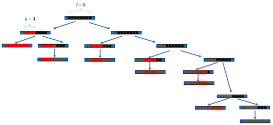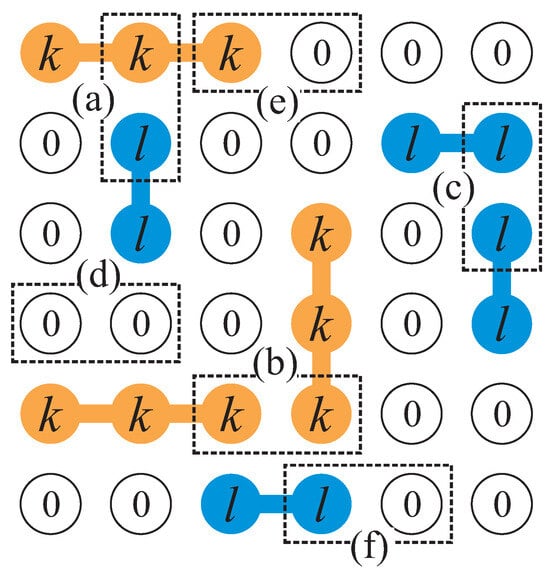 An additional layer of complexity arises from the spatial constraints in the first layer: k-mers leave behind sequences of unoccupied sites of length , where no new k-mer can adsorb. This spatial exclusion introduces considerable complexity when calculating the configurational entropy compared to the monomer case, as illustrated in Figure 1.