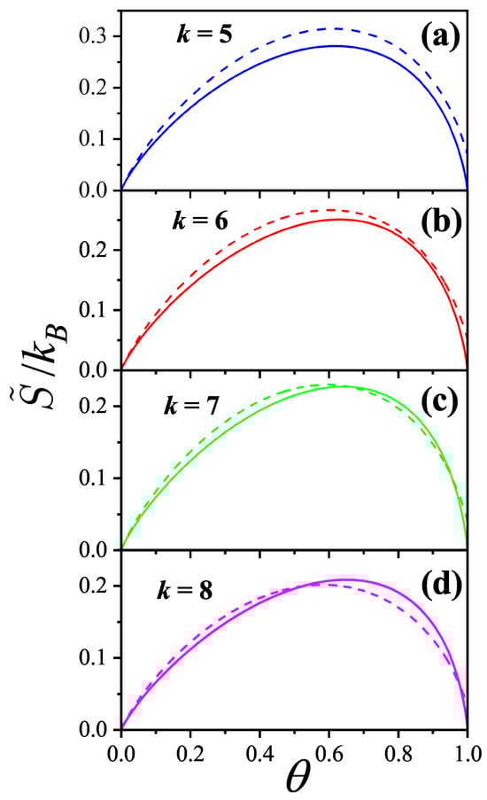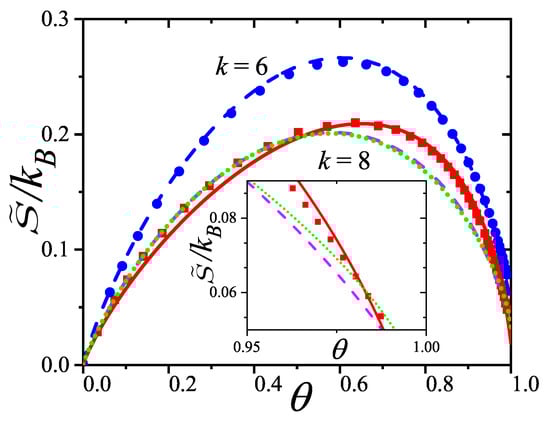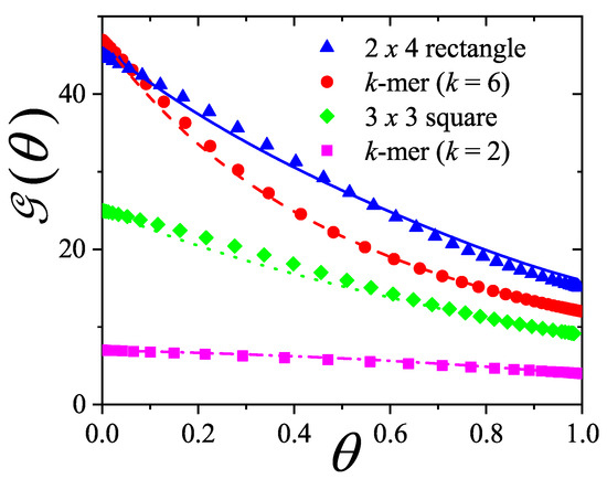 - Rodrigues, L.R.; Stilck, J.F.; Dantas, W.G. Entropy of rigid k-mers on a square lattice. Phys. Rev. E 2023, 107, 014115. [Google Scholar] [CrossRef] [PubMed]
