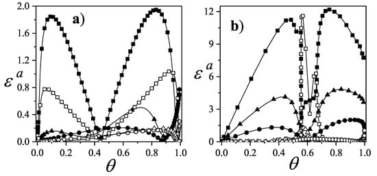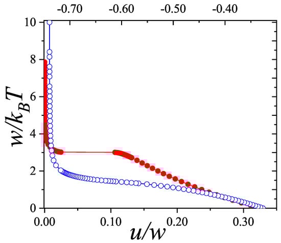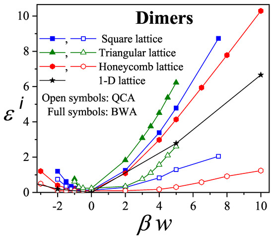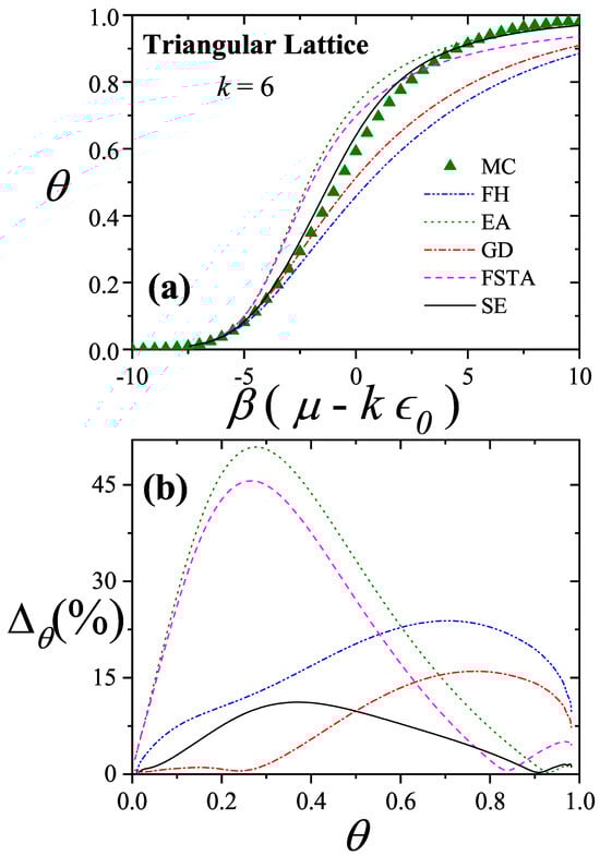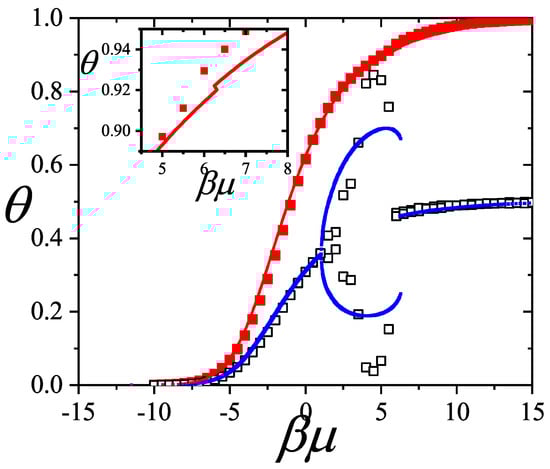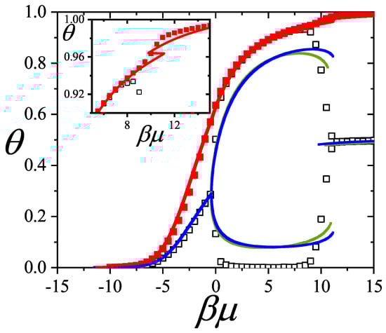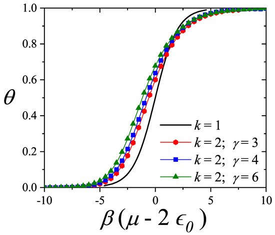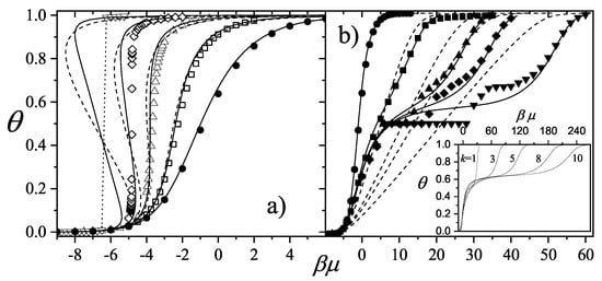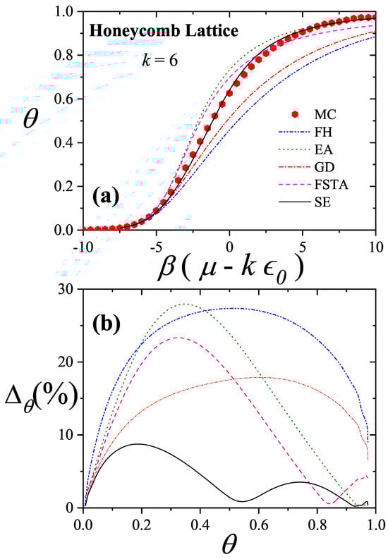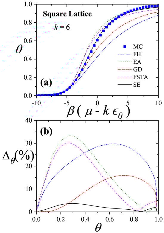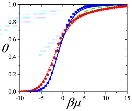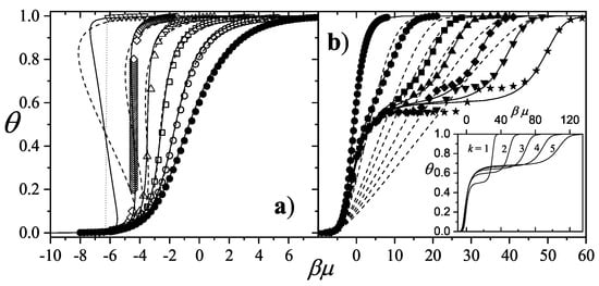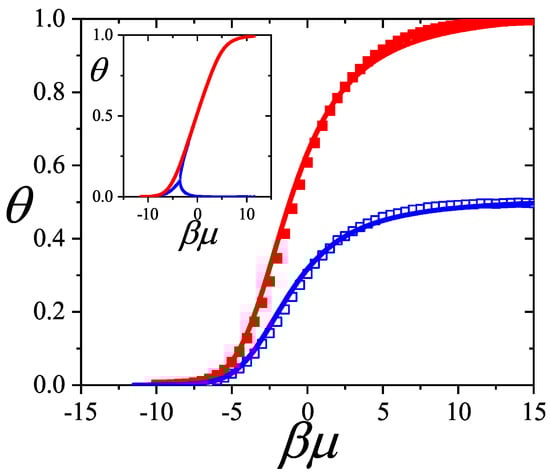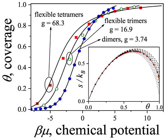 where represents the average number of adsorbed columns, while s and e denote the entropy and internal energy per site, respectively. Based on the standard definition, the surface coverage , the fraction of the lattice occupied by adsorbed units, follows directly as: