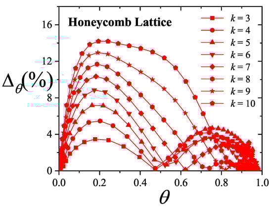 - Matoz-Fernandez, D.A.; Linares, D.H.; Ramirez-Pastor, A.J. Critical behavior of long linear k-mers on honeycomb lattices. Physica A 2008, 387, 6513–6525. [Google Scholar] [CrossRef]