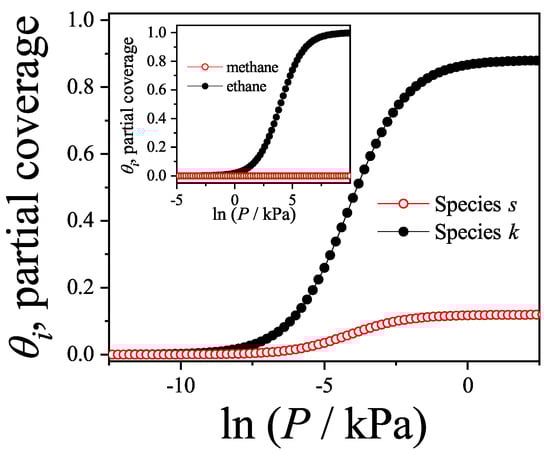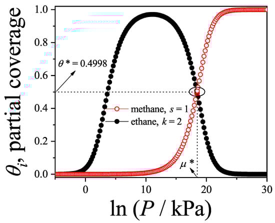 Assuming and substituting into Equation (22), the parameter naturally emerges as Henry’s law constant, inferred from the low-pressure limit of the coverage .