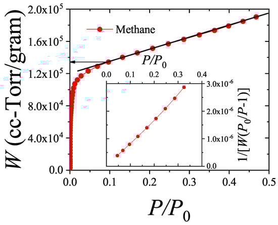 Unlike the BET equation [Equation (28)], the resulting expression [Equation (27)] is inherently non-linear in , as shown in Figure 3. This non-linearity becomes especially pronounced in the low-pressure region (), leading to significant deviations between the two models. Consequently, fitting experimental data of nitrogen or other polyatomic gases using the dimer-based isotherm could yield noticeably different values of c and compared to BET-based estimates.
