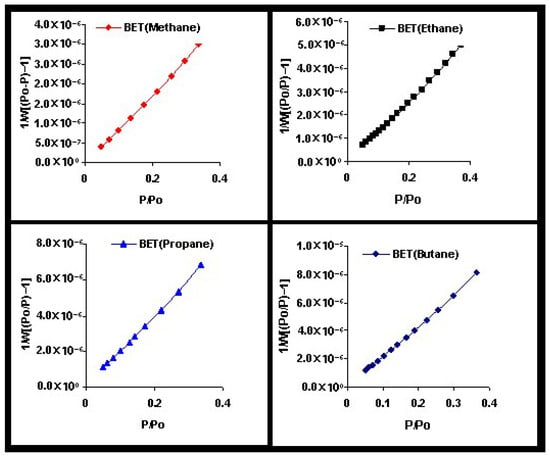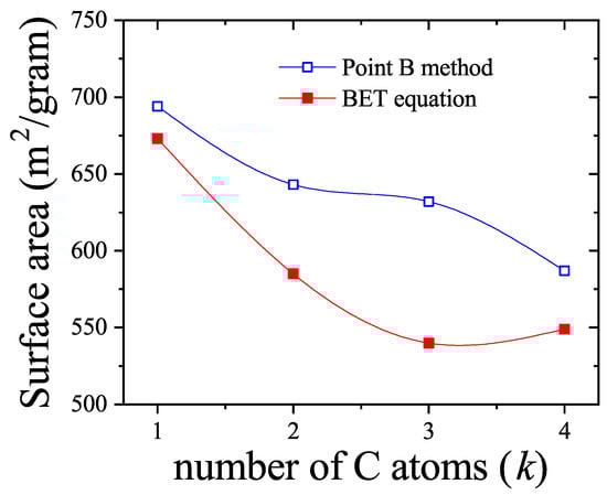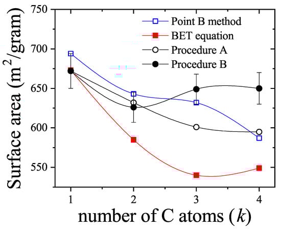 Matching terms with Equation (27) results in a mapping: and . This correction aligns with previous findings, such as the observation that the adsorption of nitrogen onto graphite leads to surface areas about 1.22 times greater than those calculated using the BET method (see Ref. [79]). These insights emphasize that considering the polyatomic nature of adsorbates results in more accurate estimates of surface areas, especially for molecules that occupy multiple adsorption sites. It is important to note that the presence of non-linear terms in Equation (27) implies that, in practice, the relationships between c, , and their BET counterparts will deviate from the simple ratios mentioned above when fitting actual experimental isotherms.