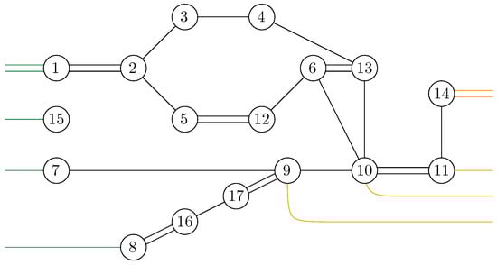 As represented in Figure 10, the graphs and are trivial; hence, . The graph can be factored as a parallel composition of two other graphs, as represented in Figure 11: