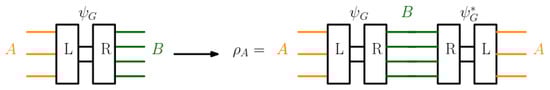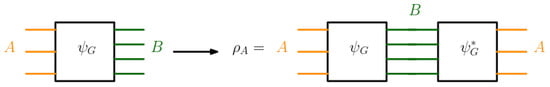An illustration of a random tensor network is provided in Figure 1, where the boundary region of G is provided by all the half-edges . In Figure 1, the region A is defined as the set of half-edges at the vertices , that is, . The complementary region consists of the half-edges associated with the vertices , namely, .