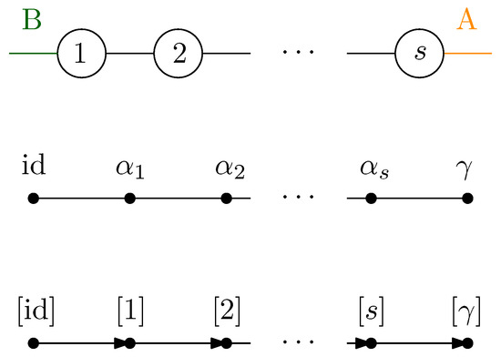 - Maximal flow. The (max)-flow approach consists of identifying the leading terms from the moment formula above as . For this, a network is introduced. This network is derived from the original graph G by connecting all of the half-edges in A to an extra vertex (sink) and all of the half-edges in B to id (source). In , the vertices are valued in the permutation group , with all the half-edges connected either to the source id or to the sink . The flow approach consists of looking at the different paths starting from the source id to the sink . The different paths in the flow approach induce an ordering structure (more precisely a poset structure) in the network . Intuitively, the maximal flow will consist of searching the maximal number of these paths such that the source and sink will be disconnected upon removing the paths from the network. More precisely, by Menger’s theorem, the maximum flow in this graph is equal to the number of edge-disjoint augmenting paths that start from the source id and end in the sink . Figure 7 represents the different paths achieving maximal flow in the network from the original graph G as represented in Figure 1. This procedure allows us to find a lower bound to the Hamiltonian that can be attained by some choice of the variables .