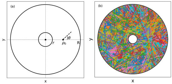 Figure 1a illustrates the search space comprising the 2D region between the inner and outer concentric absorbing rings of radii r and R, respectively. The searcher leaves from a distance to the center of the annuli. Each random step is characterized by a length and an angle defined, e.g., with respect to the horizontal positive semi-axis. Random search models usually consider ℓ and as independent variables, with values drawn from probability distributions and , respectively. Here, we take the angles as uniformly distributed, , and focus on the search behavior as the parameters that set are varied.
