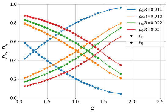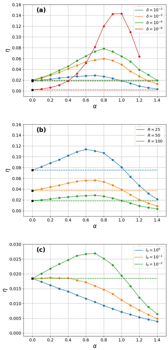 If, on the other hand, any of these three parameters gets progressively far from the respective limits, we observe in Figure 2a–c a gradual downshift of in the range . For instance, in Figure 2a, we notice a decrease in toward the value upon an increase in the relative starting distance from to , while keeping the other parameters fixed. Similarly, a reduction in is also observed by either decreasing R or increasing ; see Figure 2b,c, respectively. Interestingly, we note in Figure 2c that for large enough values, the ballistic strategy is the one with the maximum . In all cases, we observe a nice match of the numerical data to the exact analytical result in the ballistic limit, , with in Equation (4), which are depicted in black squares in Figure 2a–c and indicated by the horizontal dashed lines as .