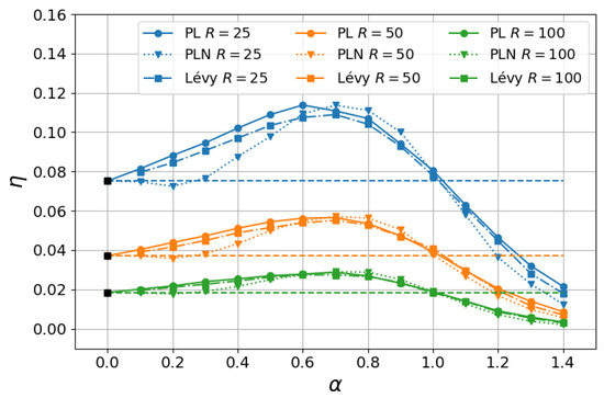 In this sense, we show in Figure 3 a comparison between the numerical results when the step lengths are drawn from power-law and Lévy -stable distributions. Parameters were chosen as in Figure 2b, with fixed and , and choices of the external radius (blue), (orange), and (green). Two aspects can be observed in Figure 3. First, as mentioned, the power-law distribution given in Equations (1) and (2) corresponds to the dominant term in the large-ℓ expansion of the symmetric Lévy -stable distribution [18,19]. In fact, we notice in Figure 3 that the results for the power-law (PL shown as circles) and Lévy (squares) distributions are close in the case of the largest external radius (green curves), and they became progressively different as smaller R were considered, as expected. Another interesting aspect is comparing these results with those in which each step length results from a sum of N power-law-distributed random variables (PLN shown as triangles). More precisely, in this case, each step length is given by , where each is drawn from the power-law probability density given in Equations (1) and (2). As commented above, the generalized CLT states [18,19] that the of the PLN case converges in the limit to a Lévy -stable distribution if is a set of independent and identically distributed variables and (for , the Gaussian and CLT are retrieved). In other words, noises arising from power-law probability distribution functions are not stable in the context of the CLT, in contrast to the -stable noises, though their statistics present similar long-range behavior. We note in Figure 3 that the results for Lévy and PLN are similar for the largest , though some differences arose for , mainly in the regime in which the first momentum of the Lévy and PLN distributions diverge. A more comprehensive study of how these results approach as much larger N are considered, as stated by the generalized CLT, is left for future work.