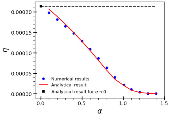 where we have introduced the quantity given in terms of the other parameters so that the limit when is retrieved. Figure 7 displays through a dashed line the good fit of the numerical data to Equation (18).