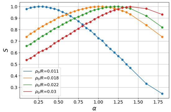 On the other hand, in the opposite regime of steps typically very small, i.e., in the limit with , the finding of the inner or outer annulus is equiprobable when the searcher is initially nearly equidistant from both annuli, , with large R. In this case, one has and for and , leading to a monotonically increasing S for . We note in the curves of Figure 6 that the trend for a monotonically increasing entropy in this interval emerged as higher values of were considered, being almost already achieved for .