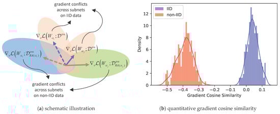 Gradient conflicts in shared weights when subnets are trained on IID vs. non-IID data.