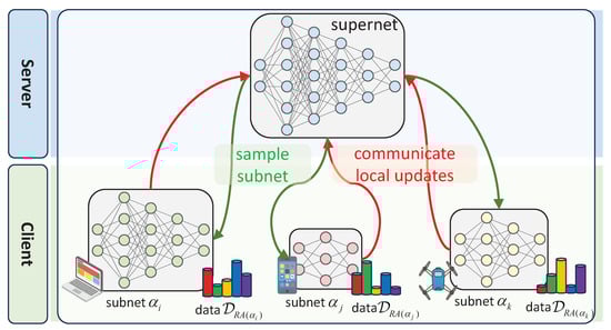 When sample-based one-shot NAS is transferred to FL scenarios—comprising one server node and N clients with non-IID data —most federated NAS methods have naturally adapted (2) to a resource-aware federated supernet training strategy, as depicted in Figure 2. The core of this strategy is to assign sampled subnets to suitable and compatible clients based on computational resources [11,12,13], thereby making full use of distributed resources. Assuming that a subnet is assigned to client in the resource-aware assignment strategy, the resource-aware federated supernet training strategy can be formulated as follows: