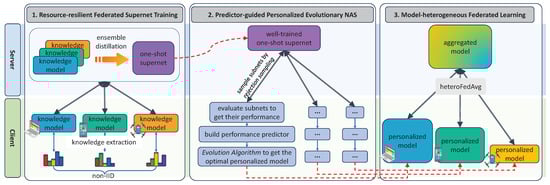 In this section, the detailed design of HAPFNAS is presented. As shown in Figure 3, our HAPFNAS consists of three pivotal parts: (1) a resource-resilient federated supernet training strategy for training a one-shot supernet; (2) a predictor-guided personalized evolutionary search algorithm targeted at searching for promising personalized models for FL clients based on a well-trained supernet; and (3) a model-heterogeneous FL algorithm termed heteroFedAvg to facilitate collaborative learning among clients’ searched personalized models. Each of these parts will be discussed sequentially in the following.
