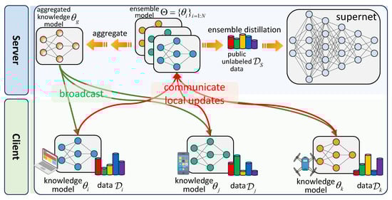 After the local training, the clients transmit the updated knowledge models to the server. Then, the server aggregates all of the received knowledge models to update the global model as , and then broadcast to clients in the next communication round.