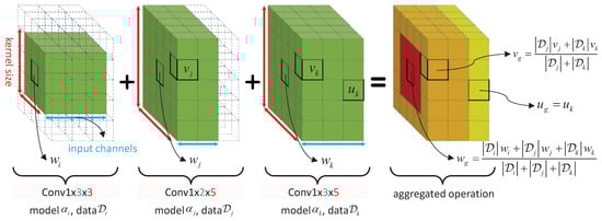 To clearly illustrate this aggregation process, we present an example of fine-grained parameter aggregation that involves three convolution operations from three clients’ personalized models, as shown in Figure 6. These convolutions differ in input/output channels and kernel sizes, to be specific ‘Conv1x3x3’, ‘Conv1x2x5’, and ‘Conv1x3x5’ from left to right in Figure 6. For each weight parameter v (indicated by the green cube in Figure 6), the weighted average aggregation based on local data sizes can be formulated as