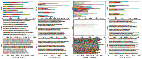 Simulated non-IID data over FL clients where different colors represent different classes. From top to bottom: CIFAR-10, CIFAR-100, and Tiny-ImageNet. From left to right: 8, 12, 16, and 20 clients.