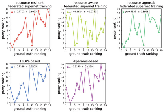 We train supernets separately using two federated supernet training strategies: (1) our proposed resource-resilient strategy, and (2) the resource-aware strategy adopted by existing works [11,12,13]. Additionally, we further consider a resource-agnostic federated supernet training strategy that ignores resource constraints, allowing free subnet assignment across all clients. Note that, in resource-agnostic strategy, all subnets can be viewed as updating based on the joint data distribution over clients. Then, we evaluate the ability of the trained supernets to serve as performance proxies in predicting performance rankings of the above 19 subnets. Moreover, we also include two strong baselines—FLOPs and the number of parameters (#params)—which are widely recognized as reliable indicators of performance ranking [47].