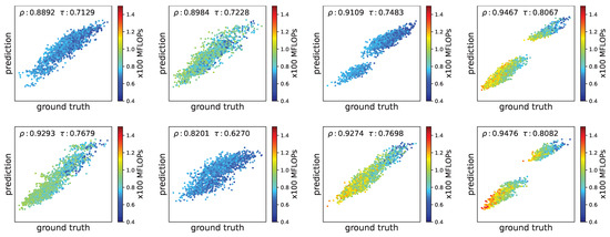 Ranking correlation between the ground truth performance and the predicted performance by random-forest-based performance predictors across eight clients. Each point represents a candidate architecture, with color indicating its FLOPs as shown in the colorbar.