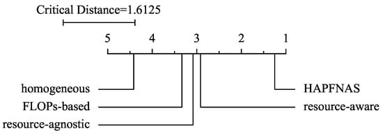 To further investigate pariwise differences, we adopt the Bonferroni–Dunn test [48], treating our HAPFNAS as the control. At a significance level , the critical distance is calculated to be 1.6125, given 5 compared strategies across 12 tasks (3 datasets, 4 client numbers). The corresponding critical difference (CD) diagram is shown in Figure 10. According to the results, our HAPFNAS achieves the highest average rank among the five evaluated strategies. Furthermore, it demonstrates statistically significant performance improvements compared to the ‘resource-aware’, ‘resource-agnostic’, ‘FLOPs-based’, and ‘homogeneous’.