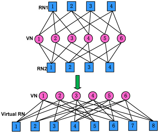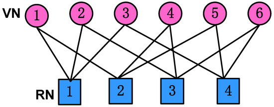 where and are the codebooks of the transmitted signals and , respectively. The virtual indicator matrix can be represented by a joint factor graph, as shown in Figure 3, which consists of virtual resource nodes and variable nodes.