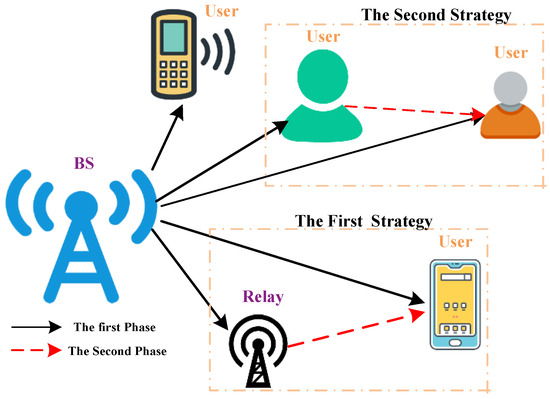 As shown in Figure 2, the two-phase cooperative transmission strategy is deployed. We assume that these J users are partitioned into two groups, with the first group being located near the BS and the other group being far from the BS and needing a relay to improve system performance. The relay is assumed to work in a half-duplex manner, i.e., it cannot transmit and receive message simultaneously. Specially, this relay is used to decode-and-forward (DF) the message. In the first phase, the BS broadcasts the superimposed signal to all the users and the relay. In the second phase, the relay carries out SCMA detection and then broadcasts the detected messages after SCMA modulation.