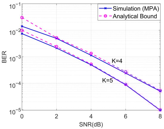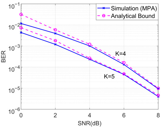 In this subsection, we investigated the BERs of the proposed downlink cooperative SCMA system under an AWGN channel. We first compared the BER performance of the analyzed and MPA detector for the proposed cooperative SCMA system with and , as shown in Figure 4. The theoretical average BER was computed according to (27) and the steps of the MPA were discussed in Section 3. As can be seen from Figure 4, it is straightforward that the analytical bounds are almost overlapped with the simulated BERs for both and in the moderate and high-SNR regions.