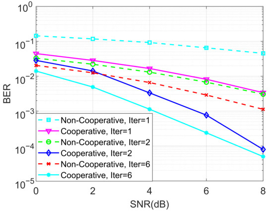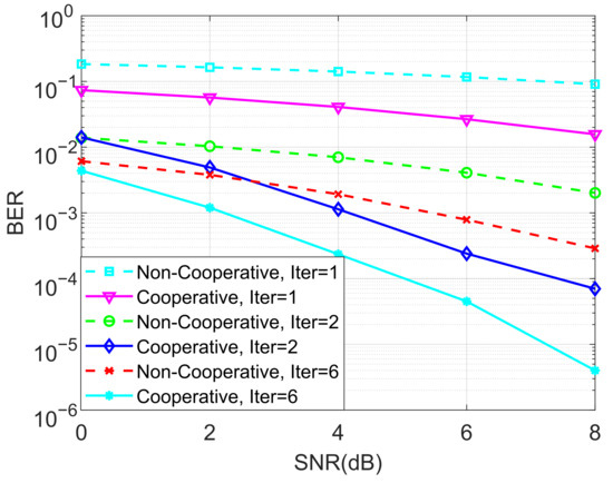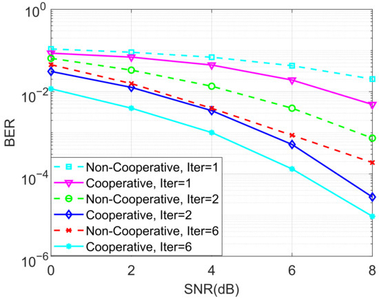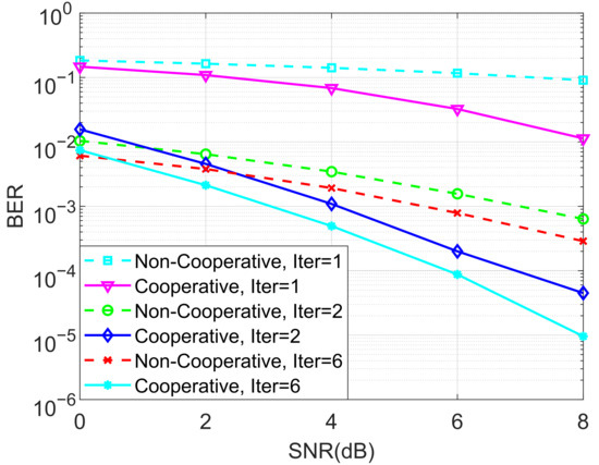 In the next stage of simulations, the BERs of the proposed ideal cooperative SCMA system under an AWGN channel and different iterations of the MPA detector for and are depicted in Figure 5 and Figure 6, respectively. It is observed that the BER performance of the cooperative SCMA system is better than that of the non-cooperative one. This is because the location of users in the second group is far from the BS, and the strength of the signal received by these users is relatively weak. Moreover, the cooperative SCMA system suffers from large decreases in BER performance when the number of iterations for the MPA detector is not large enough. Simulations demonstrated that six iterations can be used to arrive at the intended results.