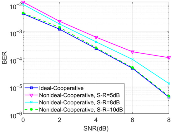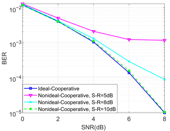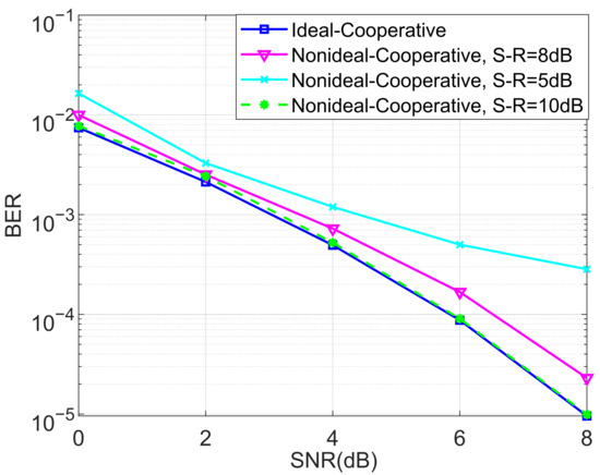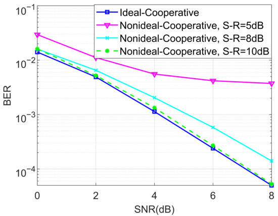 The BER performance of the proposed non-ideal cooperative SCMA system under a Rayleigh channel and different SNR of the S-R link for .