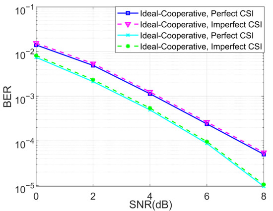 The BER performance of the proposed ideal cooperative SCMA system under a Rayleigh channel with imperfect channel state information for and .