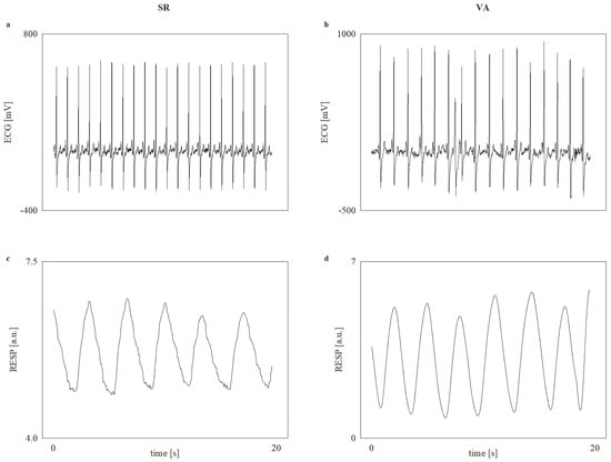 Experiments were conducted in the morning, between 7 and 8 a.m., in quiet surroundings in a room at the Pacemaker Center of the University Clinical Center of Serbia immediately before device implantation. The electrocardiogram (ECG) and the respiratory signal were acquired during 20 min of recording in relaxed subjects in the supine position and spontaneous breathing frequency without verbalization. Measurements were performed by using the Biopac MP100 system and Acqknowledge 3.9.1 software (BIOPAC System, Inc., Santa Barbara, CA, USA) using a 1 kHz sample rate and a 16-bit amplitude resolution. ECG data were acquired from lead I using the ECG 100C amplifier module, while an RSP 100C respiratory pneumogram amplifier module with TSD 201 strain gauge transducer attached to the belt was used to measure abdominal expansion and contraction as an estimation of the respiratory signal (RESP) [7,17]. Examples of the recorded signals are reported in Figure 1 for representative SR and VA subjects.