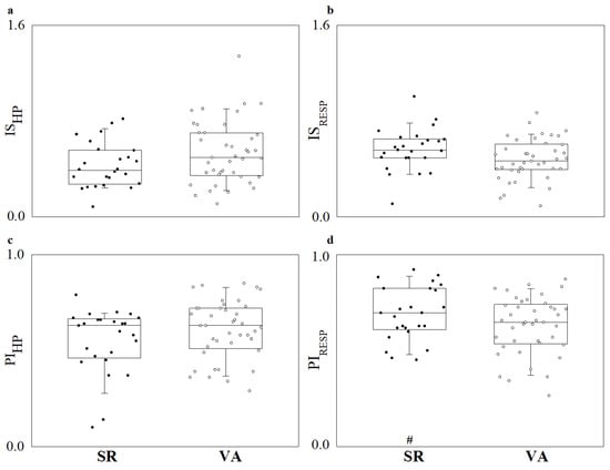 Figure 2 reports the complexity indexes of IS (panels a and b) and PI (panels c and d) as boxplots with the individual values for each patient for the evaluation of the regularity of HP (panels a and c) and RESP (panels b and d). It can be observed that IS (panels a and b) and PI (panels c and d) show a non-significant change for both the HP (panels a and c) and RESP (panels b and d) series when considering VA patients compared to SR patients. Furthermore, only SR patients show a significantly higher predictability for the RESP series compared to the HP series when considering the PI index, while IS shows a similar trend but no statistical significance.