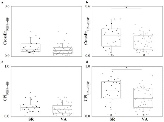 Boxplots reporting (a) cross-entropy (CrossEn) in the direction; (b) CrossEn in the direction; (c) cross-predictability index (CPI) in the direction; and (d) CPI in the direction. * indicates significant difference between experimental groups (i.e., SR vs. VA); # indicates significant difference between directions of interaction (i.e., vs. ).