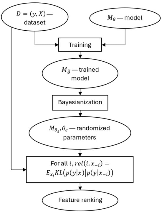 The task of the method is to rank the features of a specific dataset processed by a specific model. We train the selected model on a specific dataset. The result is a trained model . This is followed by the Bayesianization procedure, which implies the following: each specific prediction of the model is calculated while adding Gaussian noise to the model parameters (should the model parameters allow this addition) or with another randomization method. For example, when using a tree-type model, a non-terminated transition to descendant nodes is performed in randomly selected ancestor nodes. The result is a Bayesian model , , which provides sampling from probability distributions and instead of deterministic outputs . The resulting samples are used to calculate feature ranking based on the Kullbach–Leibler divergence estimate.