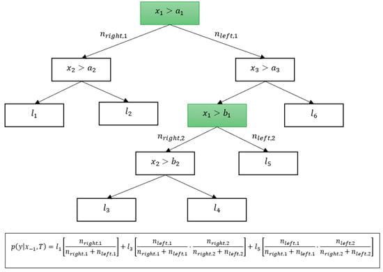 where is the probability assigned to leaf , and is the probability of the path leading to , which is computed as the product of the expressions in (13) for each node with in it, whereas is the set of all leaves, consistent with except for . An example of such a computation is shown in Figure 2 below.