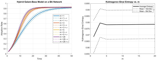 In the context of social systems, BA networks are particularly useful because they capture the emergence of hubs (influential individuals or entities) and the power law distribution of node degrees often observed in networks drawn from empirical datasets. The BA model provides insights into the dynamics of influence spread, information dissemination, and social interactions. It is widely used to model how innovations or behaviors propagate within a population, especially in scenarios where individuals are more likely to adopt new behaviors from their already connected peers [10,11,12]. Since the diffusion driven by the Bass model always reaches of the network nodes, it is useless to focus on the final number of involved units and the time span, as in other diffusion models on networks. Instead, we keep track of the randomness of the trajectories. The tool selected for this purpose is the Kolmogorov–Sinai entropy [13,14]. Of course, other measures of regularity could have been selected, such as the the Hausdorff dimension or Hurst’s H index, but they are not suitable in our context. Indeed, the former finds its best usage for characterizing the geometric complexity in the phase space of attractors, and the latter is specific for static long-term correlations rather than for evolution over time.