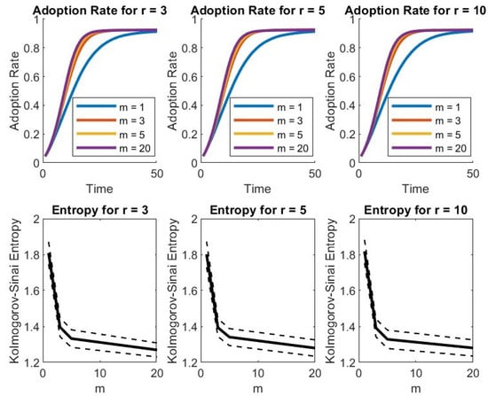 The plot of the entropy shows the relevance of the network structure. When , each new node connects through only one link, and the total number of links is minimal for the network model of BA. Therefore, a process starting at a random node has limited options to propagate compared to a BA network generated with preferential attachment parameter , with a higher number of links, where more paths are available on the network. It is worth pointing out that after the peak in the entropy decreases. This means that although it is true that the number of links (and, consequently, the paths available for the propagation of the dynamics) increases as m increases, the diffusion becomes less erratic (i.e., the entropy decreases). The reason can be seen observing the limit case of the complete network (obviously not BA), in which when everybody is connected to everybody else then the Bass dynamics end with very limited computational steps, since anyone in group B is surely connected to some node in group A because everybody is connected to everybody else. The value witnesses a specific “dangerous” moment for the dynamic to be maximally erratic. Therefore, shows a peculiar value where the trajectories can be maximally random: at any time step, the increase of adopters of the new technology has the maximal variation, due to the network structure. Either a lower or a higher number of paths improves the smoothness of the process. The node degree three has been shown to deserve attention also in the cascade correlation model of Elliot and Golub [35]. In their Figure 2, panel a in the Online Appendix a cascade failure of companies in a new market shows a peak of maximal fragility at the expected degree in the range [2.3, 4.3].