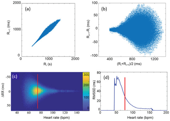 (a) Poincaré plot of a typical RR time series. (b) The same in Bland–Altman-like representation. (c) ∆RR (≡dRR) as a function of heart rate (HR), as calculated from the data in (b). The color code shows the frequency of the data. (d) The RMSSD versus HR curve (MC), determined from data in (c), as the RMS of the distribution of ΔRR values at each HR. The red lines stand for illustration of the way of calculation at an ad hoc HR value. (Reproduced from Búzás et al. [37]).