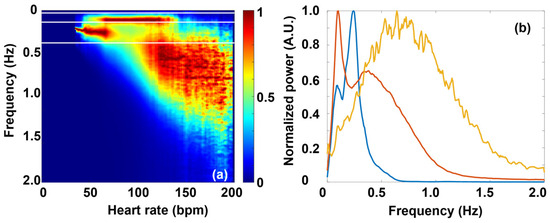 (a) Color-coded averaged Fourier map of the dRR data of all the 200 healthy individuals. (The data are normalized at each HR.) The white horizontal lines indicate the border frequencies dividing the different bands (VLF, LF, HF, and VHF). (b) Frequency spectra taken at different HRs: 50 bpm (red), 100 bpm (blue), and 150 bpm (yellow).