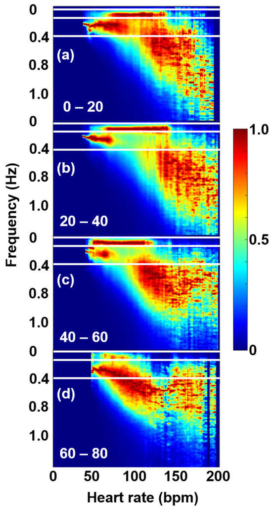 Age-cohort-averaged dRR Fourier maps, showing the shift of the core of the VHF “cloud” to lower HRs. The age cohorts are 0–20 years (a), 20–40 years (b), 40–60 years (c), and 60–80 years (d).