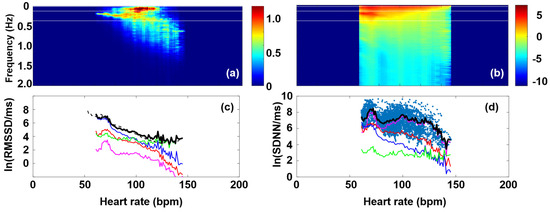 HRV analysis is nowadays routinely applied in clinical cardiology and stress-relaxation studies [25,26,27,28]. When choosing HRV measures from the time-domain, frequency-domain, and nonlinear methods to track clinical progress or performance, the choice often depends on the investigator’s intuition and preference. This choice is further complicated by the well-known but often ignored fact that changes in HR do affect HRV, e.g., a decrease in HR leads to an increase in typical HRV indices, while an increase in HR generally decreases HRV parameters such as SDNN and RMSSD [29,30,31,32]. Nearly all parameters that describe instantaneous HRV (i.e., excluding time-averaged measures) are influenced by HR, such as the time-domain, frequency-domain, or nonlinear measures [33,34,35,36,37], and this dependence is generally pivotal; namely, it usually masks the effects of all the other factors on HRV. For instance, if the relationship between the common HRV parameter RMSSD and the HR is not appropriately considered, then the variability parameter will primarily reflect changes in the heart rhythm, and it will not provide independent physiological information [37].