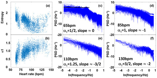 Figure 6d shows the α1 (HR) plot of the selected individual, whose RR data were used in the former HRV analyses in this paper. In spite of the relatively large standard deviation, the overall trend is clearly visible. While at the lowest HR values (HR ≈ 60–65 bpm), the DFA coefficient, α1 is close to 0.5, there is a rising tendency up to HR ≈ 120–130 bpm, α1 reaching a maximum value of shortly over 1, above which the HR range starts to decline to lower values again. The statistical meaning of this is that while HRV statistics at low HR values are close to that of an uncorrelated white noise, around its zenith it approaches α1 ≈ 1, representing a strongly correlated pink (1/f) noise, and at even higher HR values, it returns toward a less correlated fluctuation statistics. Entropy, reporting the degree of disorder, reflects a corresponding anti-correlation with the DFA exponent. The uncorrelated white-noise-like state corresponds to the highest value, and then, after reaching a minimum showing a stronger level of correlation at HR ≈ 130 bpm, it starts to rise again as HR grows (Figure 6a). Important to note is a recent unpublished preprint paper that assigns this minimum to the Piezo2 inactivation moment [2]. The corresponding frequency spectra are in line with the above: at HR ≈ 65 bpm, the noise spectrum shows a relatively flat feature (slope ≈ 0), while at other HR values it shows a steeper negative slope, reaching its extremum (slope ≈ −2) around 130 bpm, representing a 1/f2-like correlated noise.